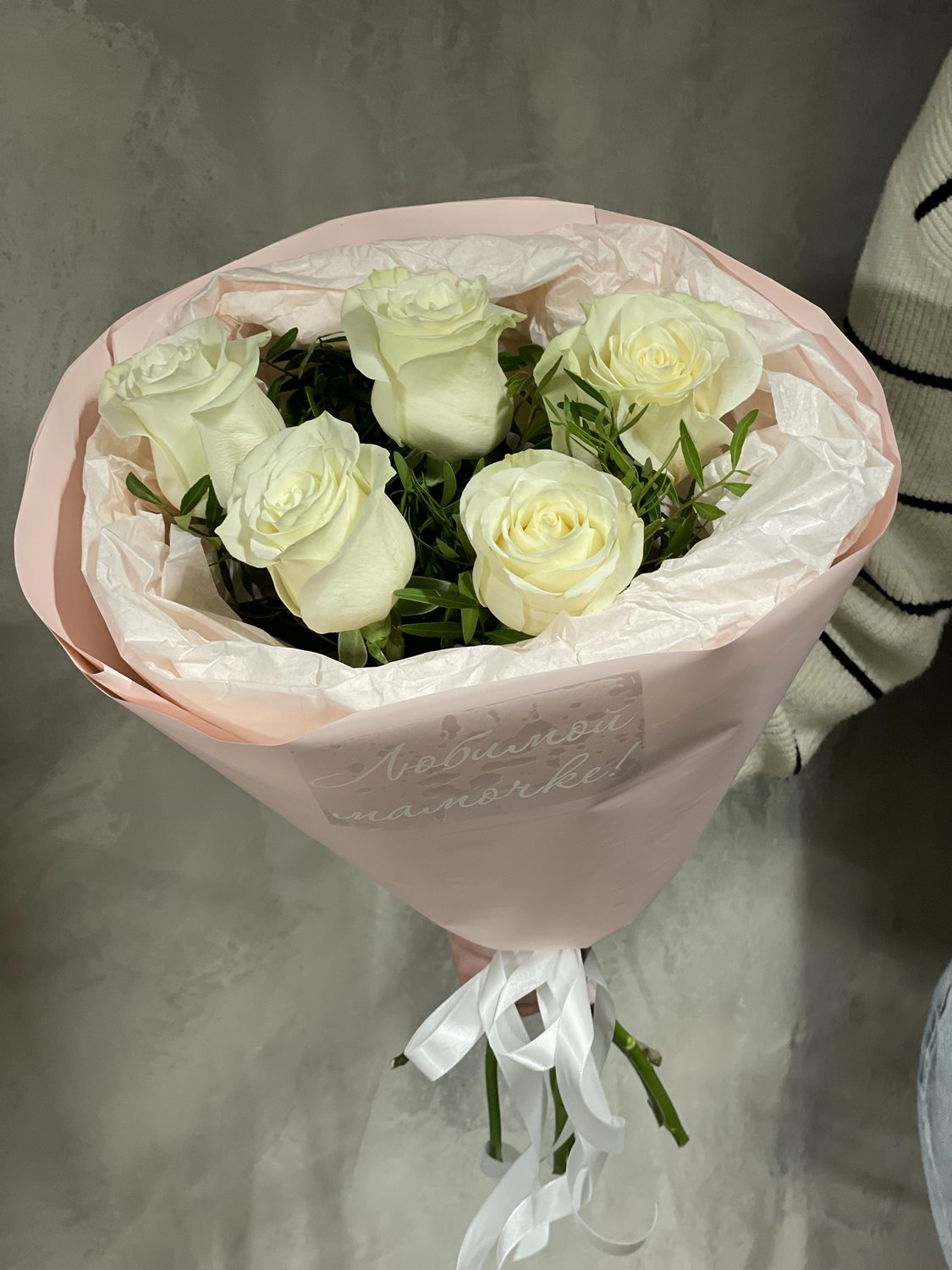 Прекрасный букет из 5 белых роз можно купить в Байконуре и Республике Казахстан за 6000 тенге с быстрой бесплатной доставкой в магазине букетов «Ultra Flowers»: